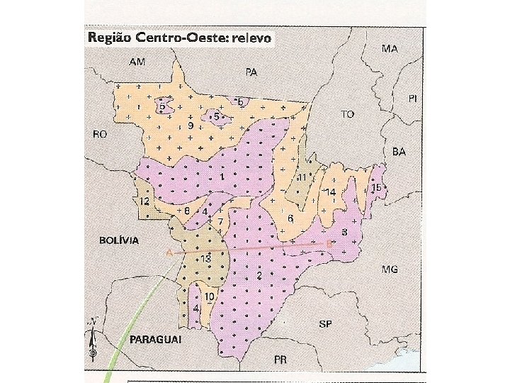 Geografia Como em quase todo o território brasileiro, o relevo da região é marcado por unidades suaves, raramente ultrapassando mil metros de altitude. Planalto Central é um grande bloco rochoso, formado por rochas cristalinas, sobre as quais se apoiam camadas de rochas sedimentares. Pantanal é uma planície inundável de formação recente, cuja altitude média é de aproximadamente 110 metros. É, portanto, uma depressão relativa situada entre os planaltos Central, Meridional. Planalto Meridional se estende da Região Sul até os Estados de Mato Grosso do Sul e Goiás. Nele são encontrados os solos mais férteis de todo o Centro-Oeste – a terra roxa que aparece em forma de manchas no sul de Goiás e em Mato Grosso do Sul.