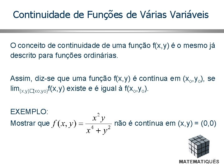 Continuidade de Funções de Várias Variáveis O conceito de continuidade de uma função f(x, y) é o mesmo já descrito para funções ordinárias. Assim, diz-se que uma função f(x, y) é contínua em (xo, yo), se lim(x, y)�(xo, yo)f(x, y) existe e é igual à f(xo, yo). EXEMPLO: Mostrar que não é contínua em (x, y) = (0, 0)