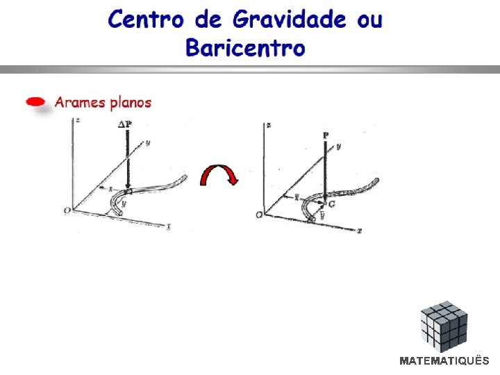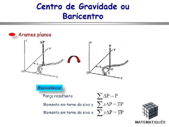 Baricentros e centróides Superfície de espessura constante Peso total P, dividida em n elementos , de pesos individuais ΔP O peso total P da superfície, conforme se sabe, é dado por: sendo que, no limite: