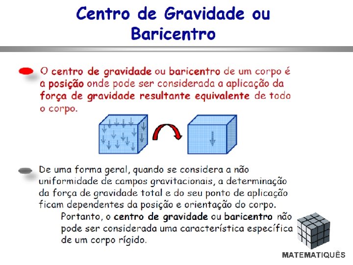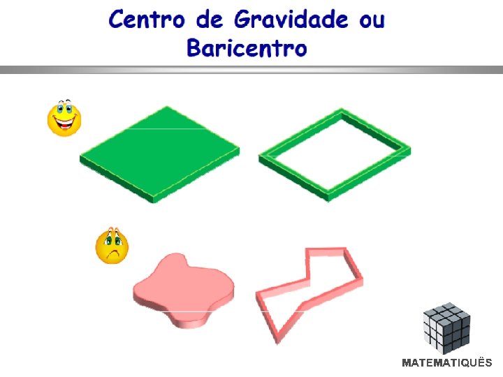 Baricentros e centróides Para determinar as coordenadas do ponto de aplicação da resultante P, denominado Baricentro ou Centro de Gravidade da superfície, basta escrever somatórios de momentos dos pesos em relação aos eixos , ou sejam: Levando tais expressões ao limite, tem-se: Analogamente às considerações feitas para o Peso P, tem-se: onde as coordenadas , denominadas Centróide ou Centro Geométrico da superfície A, neste caso particular, coincidem com as do Baricentro.