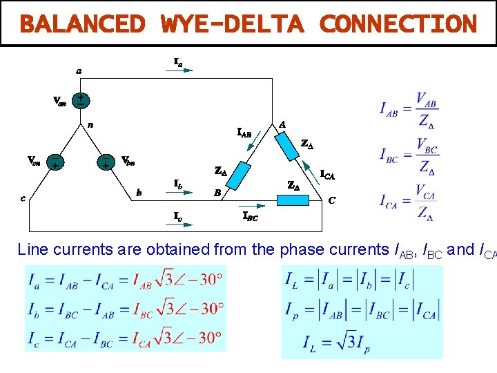 BALANCED WYE-DELTA CONNECTION Line currents are obtained from the phase currents IAB, IBC and ICA