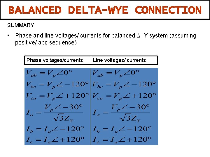 BALANCED DELTA-WYE CONNECTION SUMMARY • Phase and line voltages/ currents for balanced ∆ -Y system (assuming positive/ abc sequence) Phase voltages/currents Line voltages/ currents