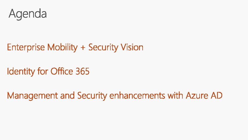 Enterprise Mobility + Security The Microsoft vision Identity Driven Security Users Employees Devices Apps Business partners Data Customers Managed Mobile Productivity Comprehensive Solution