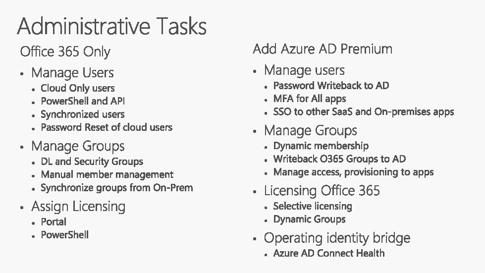 End User experiences Access apps from Office Protected access to Share. Point Online Extend to other Saa. S Administrative experiences Conditional Access On Premises Share. Point setup *Assigning licenses to users