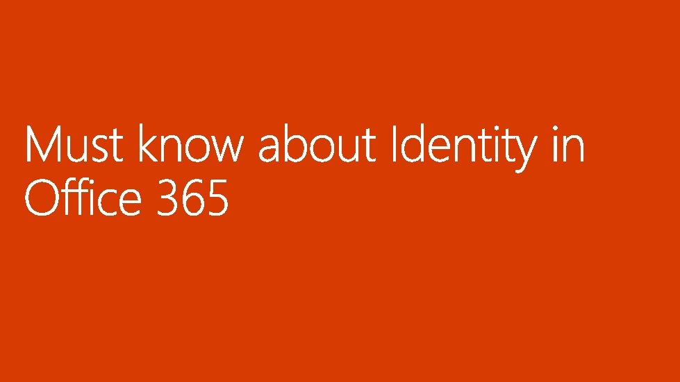 Cloud Managed Azure Active Directory Password Hash Sync Azure Active Directory Azure AD Connect sync On-Premises Identity Pros: No deployment time, No onpremises equipment. Cons: no SSO and Identity lifecycle integration with directory on premises Federated Identity Pros: Quick to deploy, same password as on-premises Cons: Currently Not Desktop SSO AD FS Ping Federate Azure AD Connect sync 3 rd Party Federated Azure Active Directory Federation Provisioning On-Premises Identity Pros: Windows Integrated Desktop SSO, Client access control, 3 rd Party MFA integration. End to End ongoing, validation and support with Office 365 Pros: 3 rd party tools and services pretested for basic auth scenarios with WS-Fed Cons: On premises deployment Cons: Second directory store in cloud. Multiple support channels Provisioning only using Power. Shell and Graph API