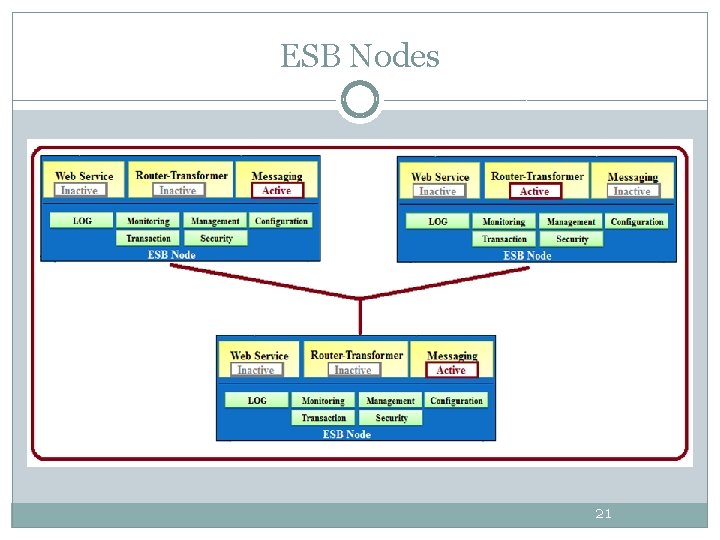 After ESB Legacy Application Enterprise resource planning New Application Cobol Application ERP J 2 EE New Application Enterprise Service Bus Routing Messaging Security Connectivity Transformation Monitoring Management Call Center Application CRM Application Java Application . Net Application 20