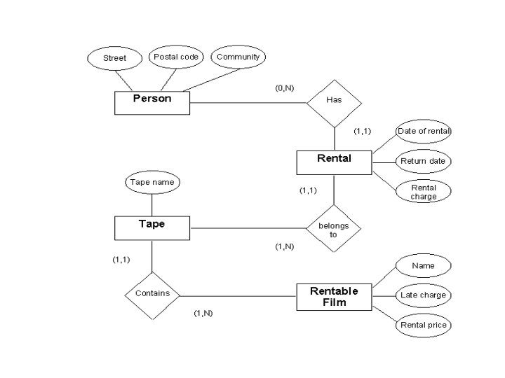 ID number ENTITY: VIDEO • • • Movie Title , Length , Copy Number , Awards , Lead Actors/Actresses , Availability (logical) Movie Title? Movie Title and Copy No. ? How to distinguish between a remake and original with the same title? May need to create an attribute that is unique -- video id number