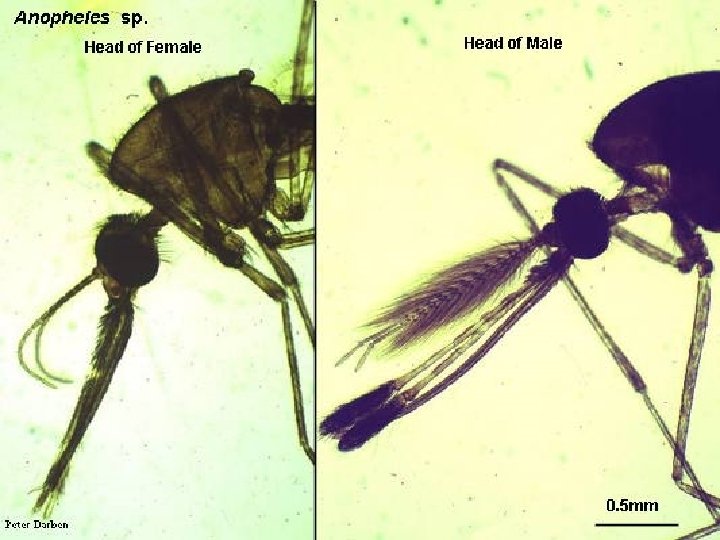 Anopheles: Female mosquitoes lay eggs on water, which hatch releasing larvae, which then converted to pupa, then within two days, adults are formed and fly out of the water. Adults ----- eggs ------ larva ----- pupa ------ adult. Here we only see the adult and larva stage.