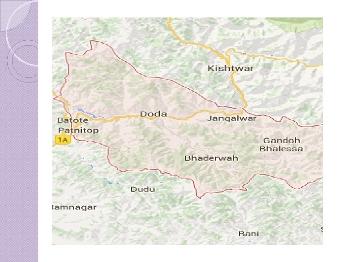 Entrepreneurial Development in Doda District �District Doda is located in the north and north east portion of Jammu province. The altitude of the district varies from 3000 ft to 15000 ft above the sea level. The land form is rugged mountainous terrain and lies surrounded by three major mountain ranges of north west Himalayas, namely, Dulidar, Peer Panchal and rest Himalayan ranges. There are numerous lofty ridges and peaks towering the tract. The tributaries of river Chenab have formed small plateaus which are suitable for cultivation �Doda district extends over an area of 11, 691 sq. kms. and has a population of 6. 90 lakhs which accounts to be 5. 26% of the total area and 6. 85% of the total population of the state