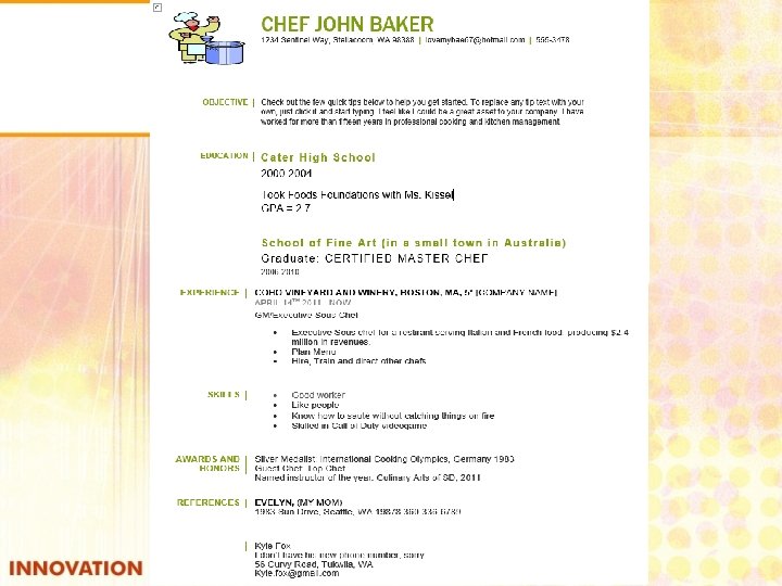 SKILLS, cont. Can include knowledge of software, foreign languages, leadership, teamwork. n Computer programs n n n Equipment n n Microsoft Office, Power. Point Presentations, Photo Shop, etc. Cash Register, Copy Machines, etc. Personal work ethics n Dependable, Punctual, Honest, Creative, Organized, etc.