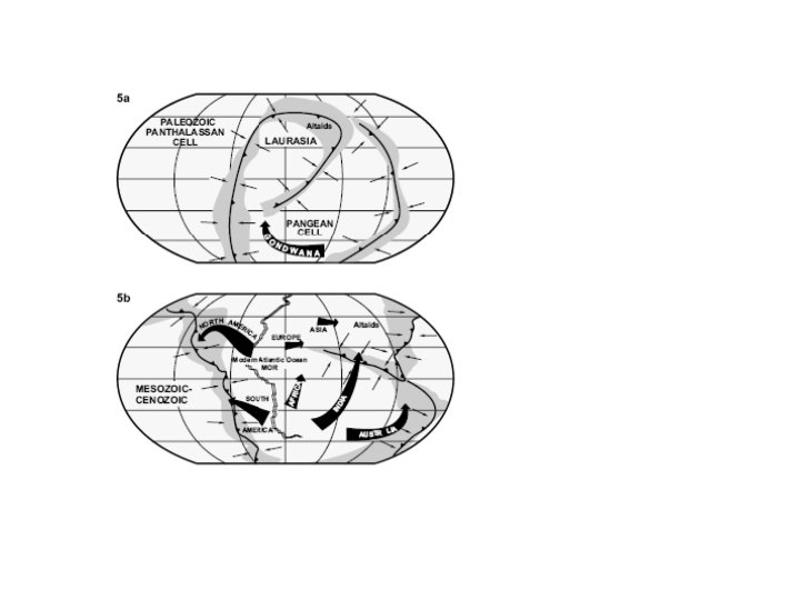 Fig. 1. Phanerozoic plate reconstructions modifed from [8, 11, 23], with addition of MOR systems. A major (Pangaean) cell, bound by a circumferential subduction zone and containing all continents, contracts through the Palaeozoic and expands thereafter. Another (Panthalassan) cell contains exclusively oceanic plates within the Panthalassan/Pacific ocean. Collins, 2003