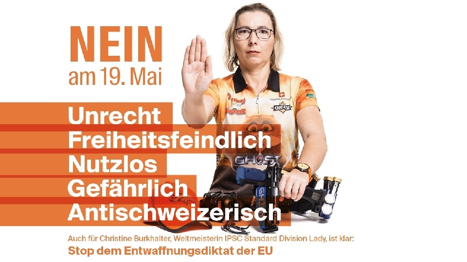 Freiheitsfeindlich Ein JA am 19. Mai bedeutet - die Umwandlung unseres jahrhundertealten Rechtes auf Waffenbesitz in ein durch ungewählte Behörden gewährtes – oder eben nicht gewährtes! – Privileg - weitere Verschärfungen des Waffengesetzes alle fünf Jahre, und zwar bis zum (nahezu) vollständigen Verbot des Waffenbesitzes für Private (Artikel 17 der Richtlinie) - in spätestens 10 Jahren ein absolutes Halbautomatenverbot für Private und «Psychotests» für alle Waffenbesitzer - das Ende des Schiessens als Breitensport - mehr Obrigkeitsstaatlichkeit und Autoritarismus, weniger Freiheit, Individualismus, Menschenrechts- und Minderheitenschutz Nein zum Entwaffnungsdiktat der EU | 13