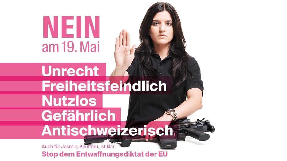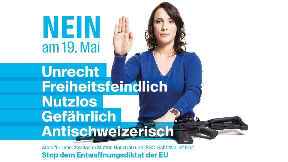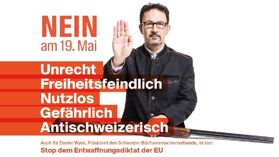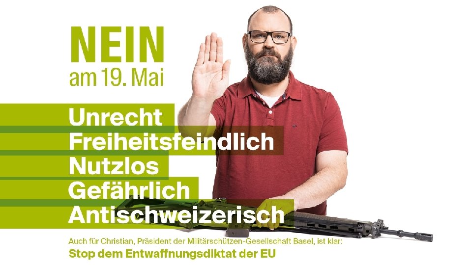 Antischweizerisch Ein JA am 19. Mai bedeutet - Zustimmung zu einem Staat, der den Bürger zum bewaffneten Militärdienst verpflichtet, ihm privaten Waffenbesitz aber verbietet - die Zerstörung unserer bestens funktionierenden und weltweit einzigartigen «Gun Culture» - die Opferung des Schönen, Einzigartigen, Traditionsreichen auf dem hässlichen Altar der – angeblichen! – Alternativlosigkeit Nein zum Entwaffnungsdiktat der EU | 19