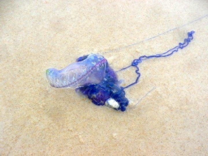 Blue Bottle Jellyfish • Elsewhere in the world it is known as the "Portuguese Man o War" as it is said to look like a Portuguese battleship with a sail • Its scientific name is Physalia utriculus
