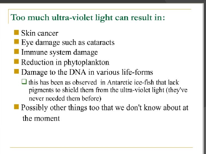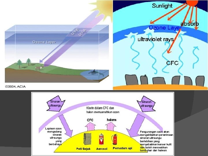 Ozone and Ultraviolet Radiation UV “light” has a high energy level and can damage exposed cells and tissues. � Ozone in upper atmosphere absorbs strongly in ultraviolet portion of electromagnetic spectrum. � Chlorofluorocarbons (formerly used as propellants and refrigerants) react with and chemically destroy ozone: �ozone “holes” appeared in the atmosphere � concern over this phenomenon led to strict controls on CFCs and other substances depleting ozone
