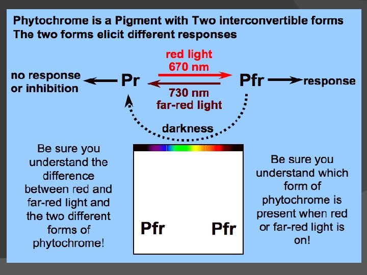 � Light quality controls Photo-morphogenesis (plant development and form) � Mediated by phytochrome (protein pigment) �red light absorbing form (Pr) �FR light absorbing form (Pfr) �Forms are photoinconvertible, depending on the which type of light is absorbed