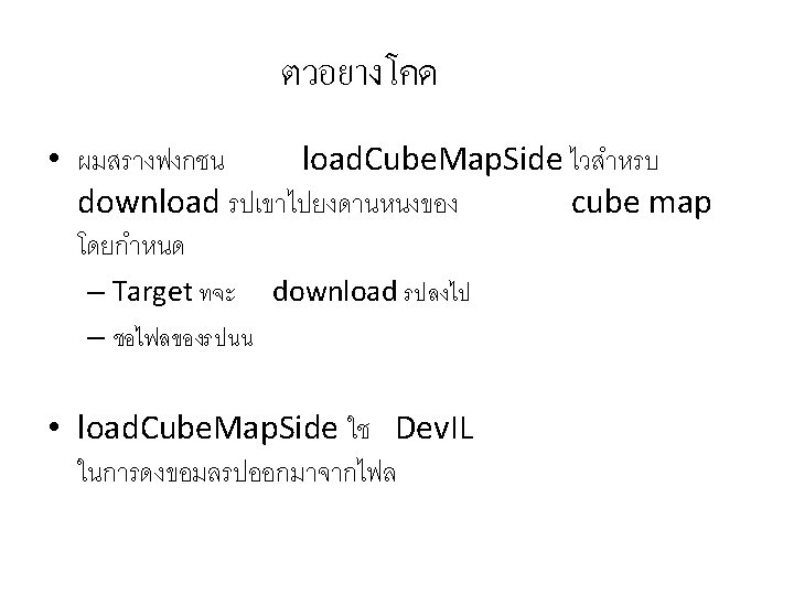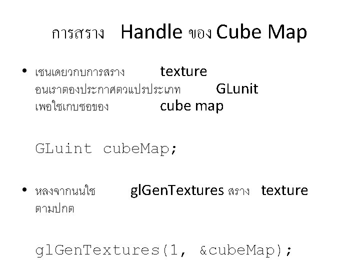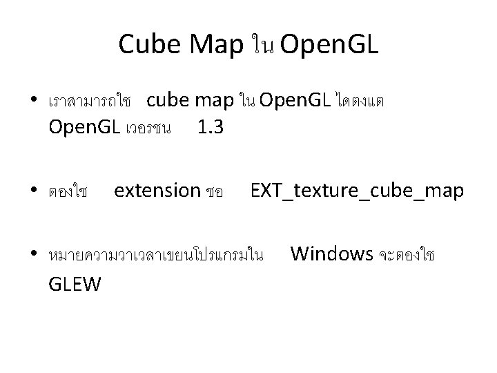 Enable การใช Cube Map • ใหสง gl. Enable(GL_TEXTURE_CUBE_MAP_EXT); • และอยาลมสง gl. Disable(GL_TEXTURE_CUBE_MAP_EXT); กอนใชงาน texture แบบอน