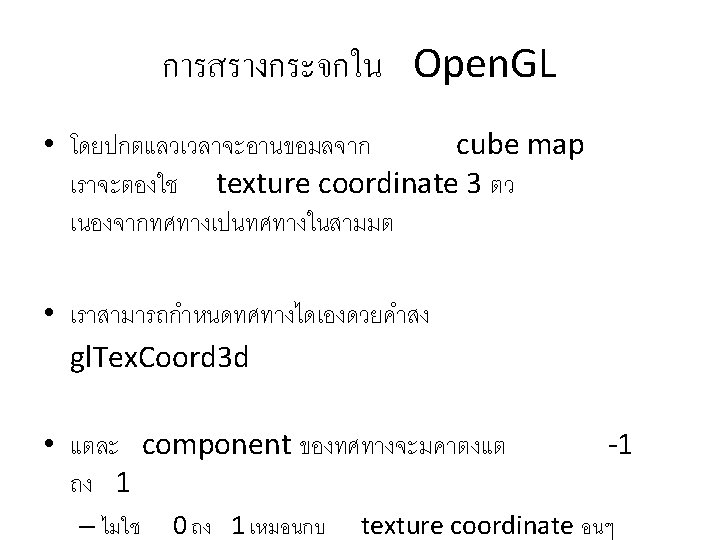 การสรางกระจกใน Open. GL • นอกจากนยงตองบอกดวยวาจะใหสราง ใหแบบใด ดวยคำสง gl. Tex. Geni texture coordinate • ในกรณการสรางกระจกเราตองสง gl. Tex. Geni(GL_S, GL_TEXTURE_GEN_MODE, GL_REFLECTION_MAP_EXT); gl. Tex. Geni(GL_T, GL_TEXTURE_GEN_MODE, GL_REFLECTION_MAP_EXT); gl. Tex. Geni(GL_R, GL_TEXTURE_GEN_MODE, GL_REFLECTION_MAP_EXT);