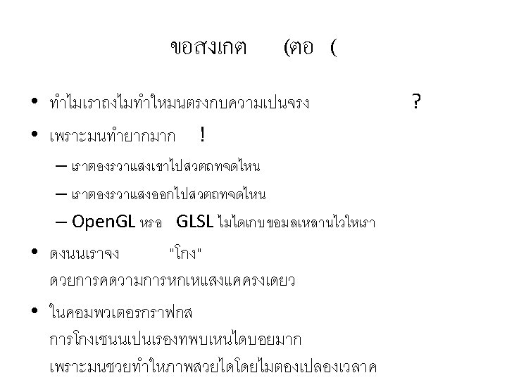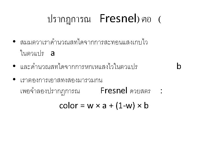 Fragment Program สำหรบจำลองปรากฏการณ Fresnel uniform uniform vec 3 eye; sampler. Cube env; float eta_ratio; float fresnel_bias; float fresnel_scale; float fresnel_power; varying vec 3 position; varying vec 3 normal; void main() { vec 3 n = normalize(normal); vec 3 eye_to_point = normalize(position - eye); vec 3 refracted = refract(eye_to_point, n, eta_ratio); vec 3 reflected = reflect(eye_to_point, n); vec 4 refraction = texture. Cube(env, refracted); vec 4 reflection = texture. Cube(env, reflected); float reflected_weight = fresnel_bias + fresnel_scale * pow(1. 0 + dot(n, eye_to_point), fresnel_power); reflected_weight = max(0. 0, min(reflected_weight, 1. 0)); gl_Frag. Color = reflected_weight * reflection + (1. 0 -reflected_weight) * refraction; }