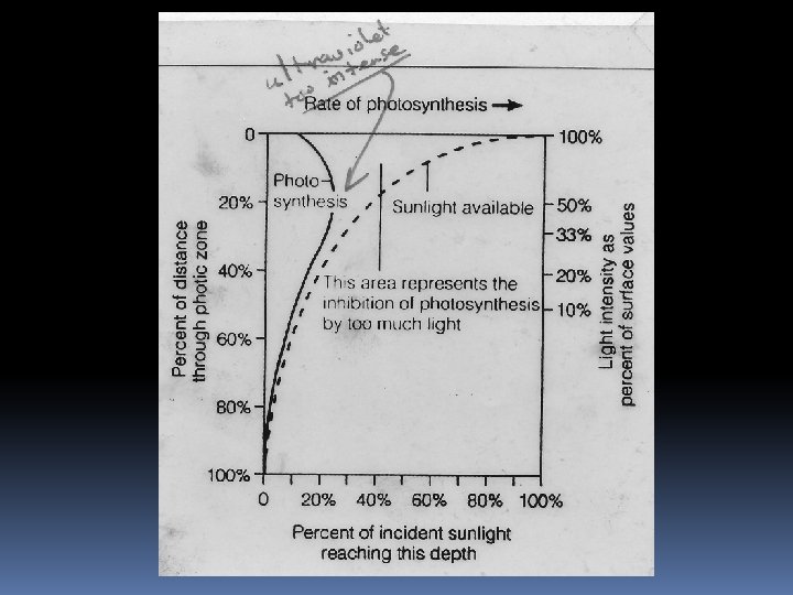 Another extremely important factor is light penetration into the ocean. • The upper part of the ocean illuminated by enough sunlight to allow photosynthesis is called the photic zone. • The part to the ocean too deep to be illuminated by sunlight is called the aphotic zone. The graph in the next slide deals with the photic zone. • The dashed line shows how the intensity of sunlight decreases with depth. • You might expect that the photosynthesis rate (solid line) of the phytoplankton would parallel the sunlight curve, but it doesn’t. • The photosynthesis rate in the upper 20% of the photic zone is less. Phytoplankton, like us, can get damaged by the Sun’s ultraviolet light, but water acts as a sunscreen. So it takes the upper part of the photic zone to block it.