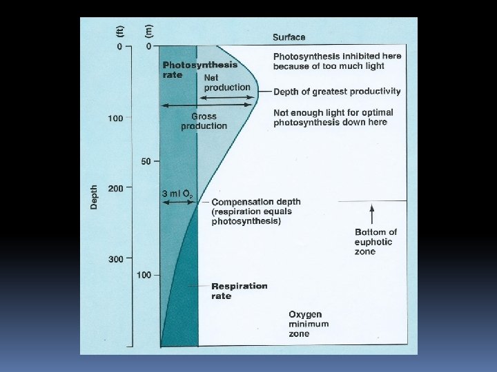 • Now in the next graph the photosynthesis rate curve is the same as in the previous graph. • The vertical curve is the respiration rate of the phytoplankton. Now even in the dark the phytoplankton has to respire, so respiration is constant with depth. • At about 70 meters down the two curves cross. Above that point the photosynthesis rate is greater than the respiration rate; the phytoplankton produce more O 2 than they need for respiration. The extra O 2 is released into the ocean. This becomes available for all the animals. • Below 70 meters the respiration rate of the phytoplankton is greater than the photosynthesis rate. The phytoplankton need more O 2 for respiration than they produce from photosynthesis. They have to absorb it from the water just as the animals do.