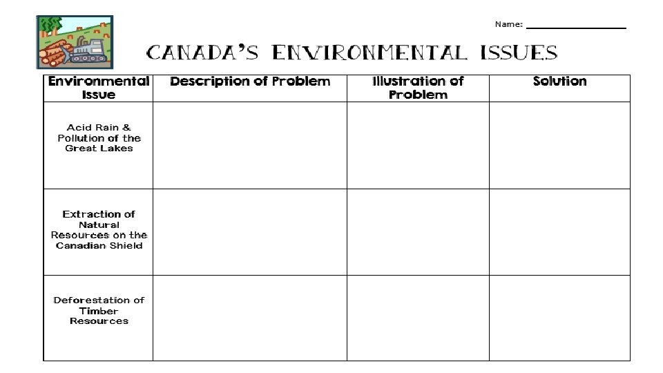 Standards SS 6 G 7 The student will discuss environmental issues in Canada. a. Explain the major environmental concerns of Canada regarding acid rain and pollution of the Great Lakes, the extraction and use of natural resources on the Canadian Shield, and timber resources.