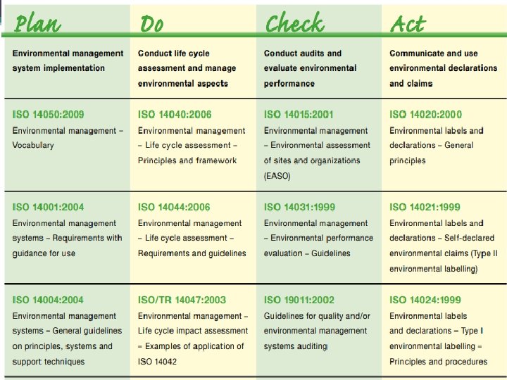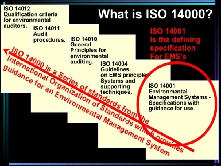 ISO 14000 series of standards provides specifications and guidelines for various environmental management disciplines, including ØEnvironmental management system (EMS), ØEnvironmental performance, ØEnvironmental auditing, ØEnvironmental labeling and life cycle assessments. ØThe most popular of the ISO 14000 series of standards is ISO 14001: Environmental Management Systems - Specification with Guidance for Use.