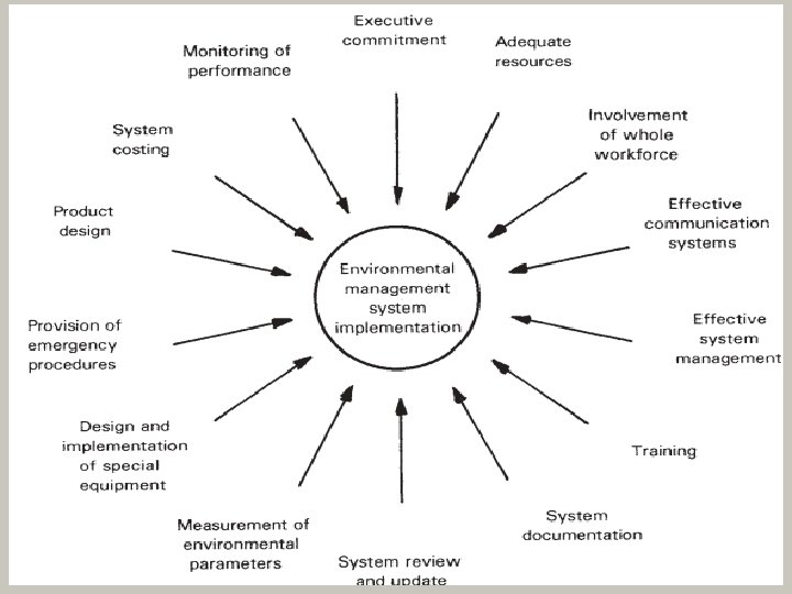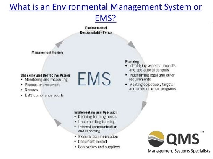 Design and Implementation of ISO 14001 Environmental Management Systems (EMS) ØThe key components in implementing an EMS that satisfies ISO 14001 (see Figure on next slide) are: commitment of company executives, cooperation of all company personnel, effective management, establishment of effective communication systems, appropriate training, design and implementation of supporting equipment, planning of emergency procedures, collection of data to monitor performance, regular system reviews and maintaining full documentation of the system.