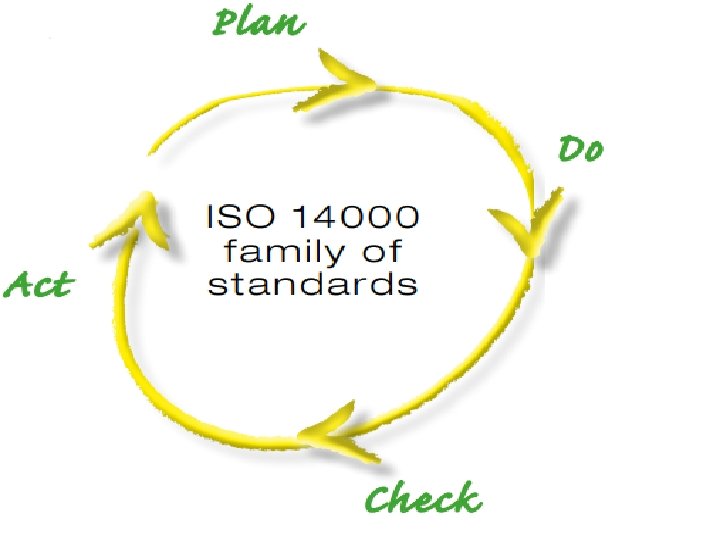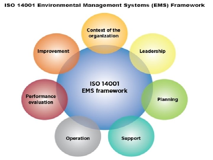 ISO 14000 framework • The ISO 14001 standard is the most important standard within the ISO 14000 series. • ISO 14001 specifies the requirements of an environmental management system (EMS) for small to large organizations. • An EMS is a systemic approach to handling environmental issues within an organization. • The ISO 14001 standard is based on the Plan-Check-Do. Review-Improve cycle.