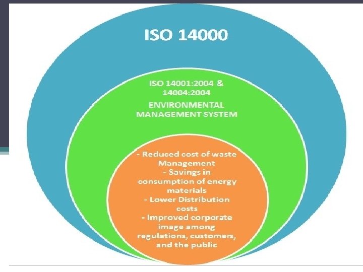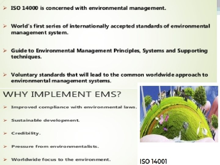 Significance of EMS ISO 14000 ØEnvironmental management ISO 14001 standards is similar importance to quality management to ISO 9001 standards in today’s businesses. Ø Apart from the need to satisfy the strict environmental control legislation that exists in most developed countries, the image of a company is damaged if pollution incidents occur, particularly if these are identified by environmental pressure groups, and this can have a severe impact on the marketability of products and services provided by the company