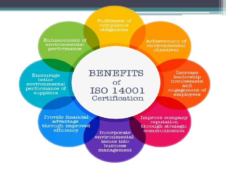 Benefits / Advantages of ISO 14001: 2015 Certification Ø Ø Ø Ø Ø Process improvement Environmental cost reduction Better relationships with regulators Better relationships with insurers, investors, and financial markets Product improvement Marketing advantages Better control of liabilities Reduced regulatory burden Protection of company image and name Demonstration of responsible management.