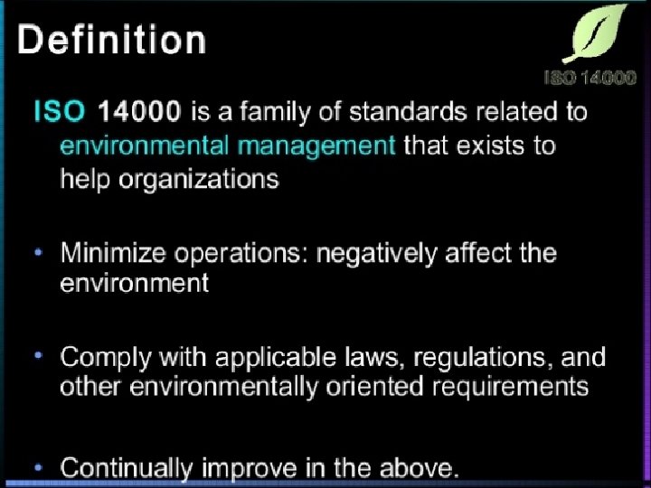 Requirements of ISO 14001 Ø The fundamental requirements of the EMS implemented are that it should: – Identify and assess the environmental impact of all of a company’s operations, and repeat this on a regular basis. – Ø Consider all of the company’s operations and activities that are identified as having a potential or actual environmental impact, and set environmental protection targets that are appropriate to the scale and impact of the operations, but within the restriction of what is technically possible and economically affordable. Ø Irrespective of cost, ensure that the company at least complies with all relevant environmental legislation (Law) that its operations may be subject to in respect of their environmental impact.