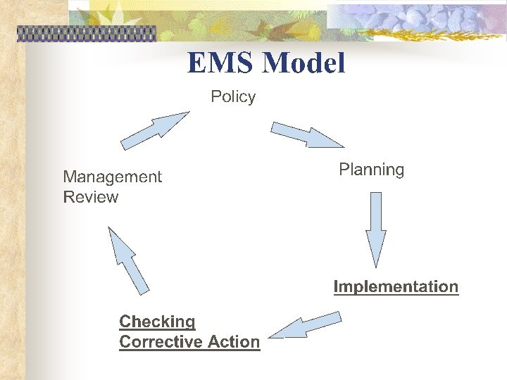 EMS Model (Plan-Do-Check-Act) Policy Management Review Planning Implementation Checking Corrective Action