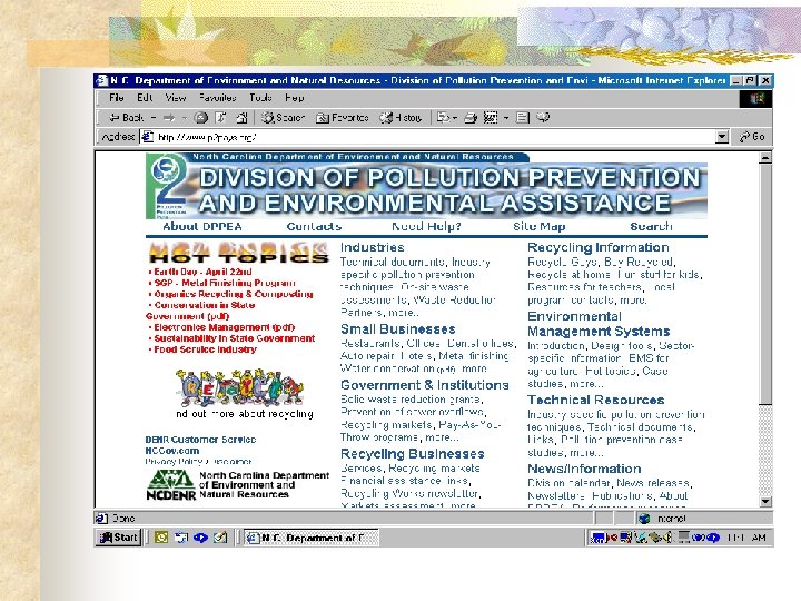N. C. EMS Related Activities n n n NC DENR EMS policy Aug. 1999 State Regulatory Innovation legislation Sector-based EMSs (paper industry, screenprinting, metal finishing, furniture): see http: //www. p 2 pays. org/iso/sector EMS Development Course for Government Agencies EMS Pilot Project with Pork Producers