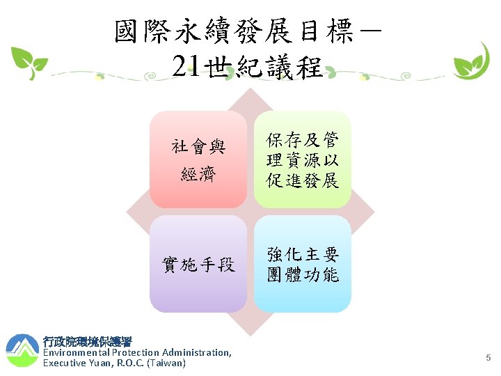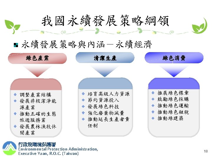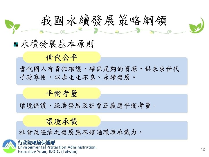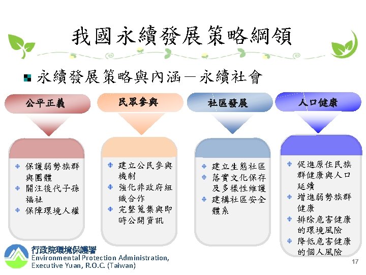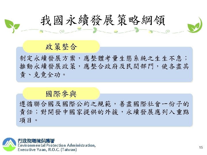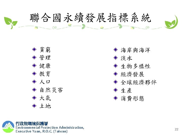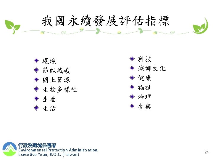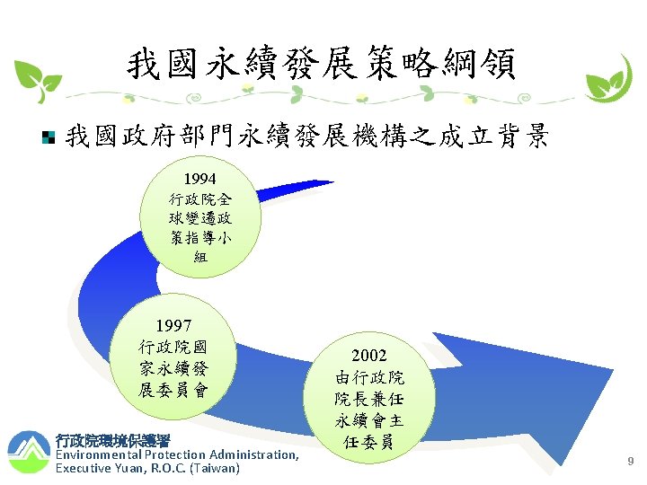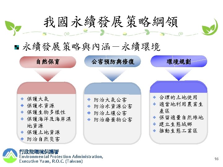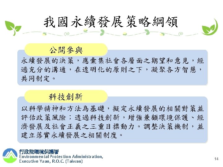 Environmental Protection Administration Executive Yuan R O C Slides: 25 Download presentation 第一章 永續發展 行政院環境保護署 Environmental Protection Administration, Executive Yuan, R. O. C. (Taiwan) 1 我國永續發展策略綱領 永續會之組織架構及 分 如右圖 行政院環境保護署 Environmental Protection Administration, Executive Yuan, R. O. C. (Taiwan) 10 我國永續發展評估指標 行政院環境保護署 Environmental Protection Administration, Executive Yuan, R. O. C. (Taiwan) 23