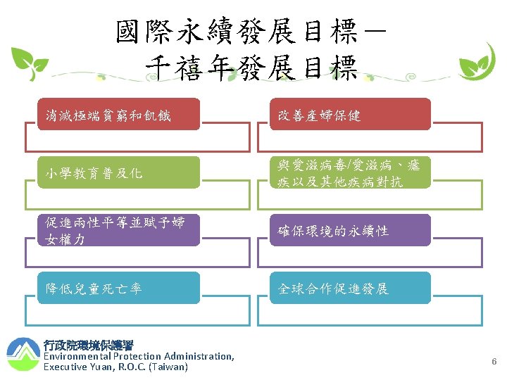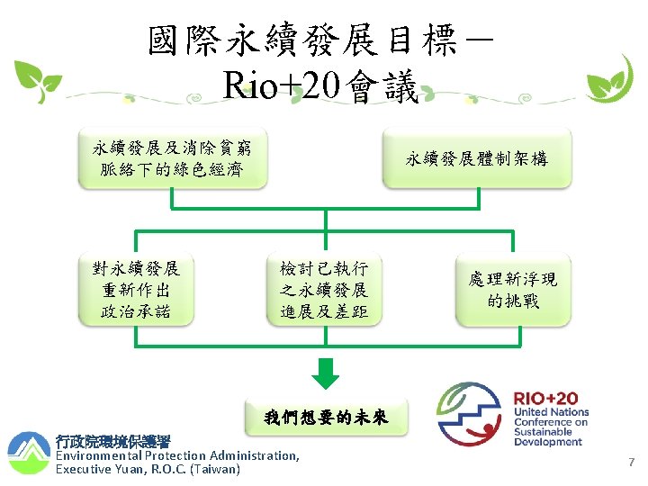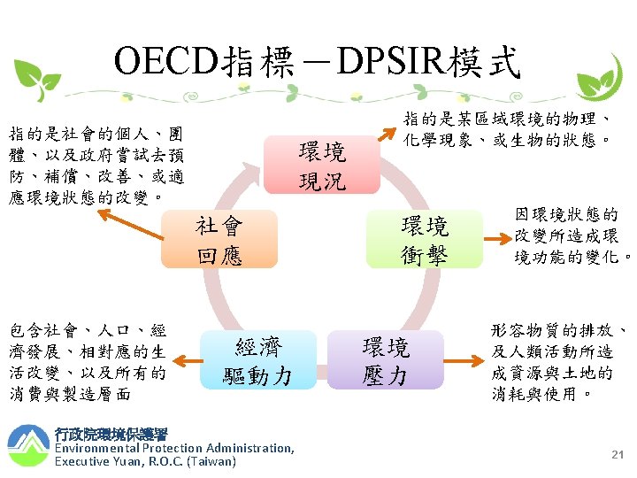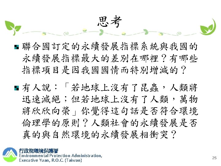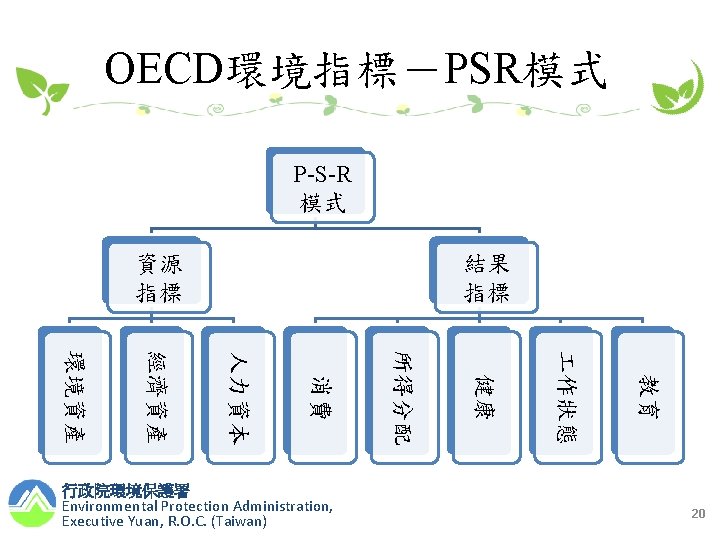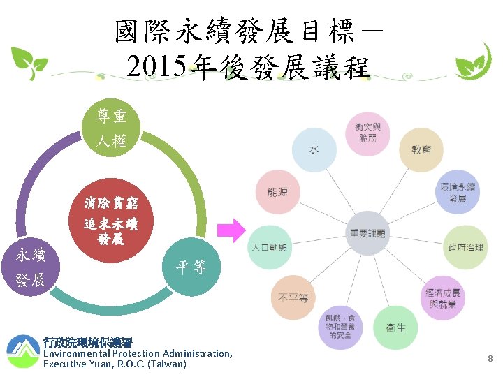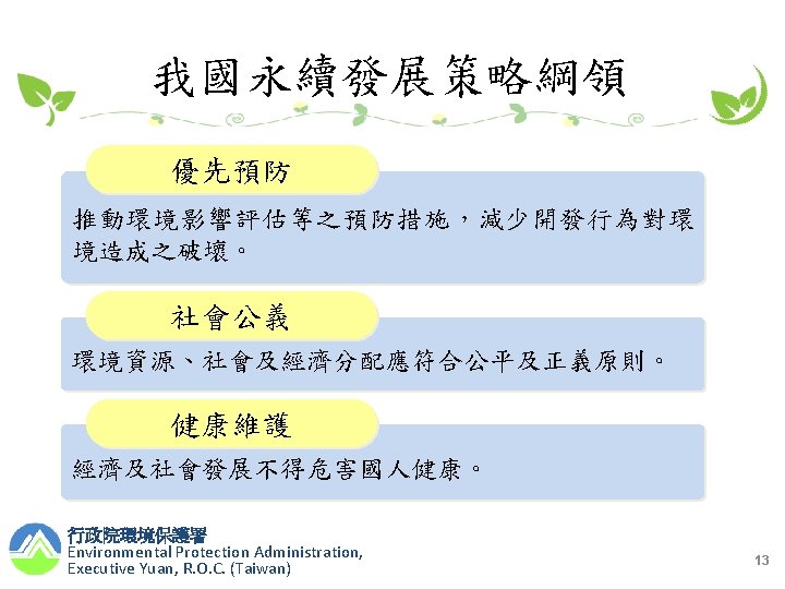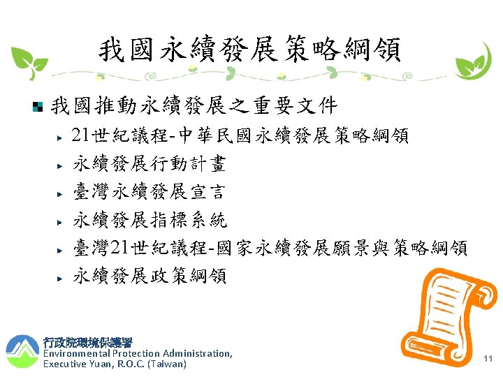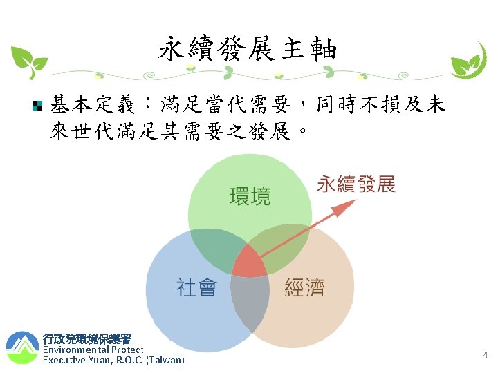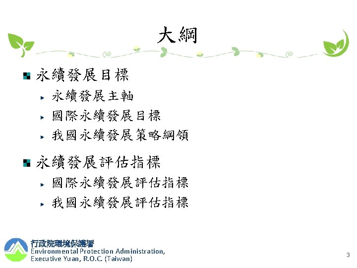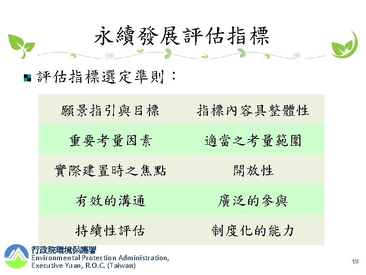Environmental Protection Administration Executive Yuan R O C Slides: 25 Download presentation 第一章 永續發展 行政院環境保護署 Environmental Protection Administration, Executive Yuan, R. O. C. (Taiwan) 1 我國永續發展策略綱領 永續會之組織架構及 分 如右圖 行政院環境保護署 Environmental Protection Administration, Executive Yuan, R. O. C. (Taiwan) 10 我國永續發展評估指標 行政院環境保護署 Environmental Protection Administration, Executive Yuan, R. O. C. (Taiwan) 23