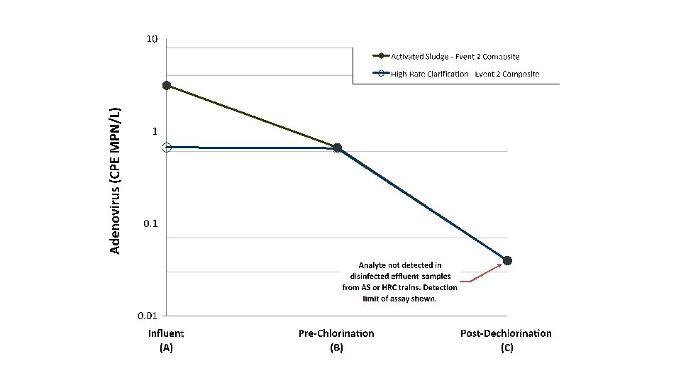 Analyte Lower concentration value in effluent Higher Logarithm 10 reduction Conventional Treatment HRC Treatment Somatic phage (PFU per ml) X X Male-specific phage (PFU per ml) X X HRC Treatment Enterococci (MPN per 100 ml) X X Campylobacter (MPN per 100 ml) X X Salmonella (MPN per 100 ml) Cryptosporidium (oocysts per L) ≈ ≈ Giardia (cysts per L) Total cultivable virus q. PCR Confirmed Adenovirus ≈ X X X ≈ ≈ X X