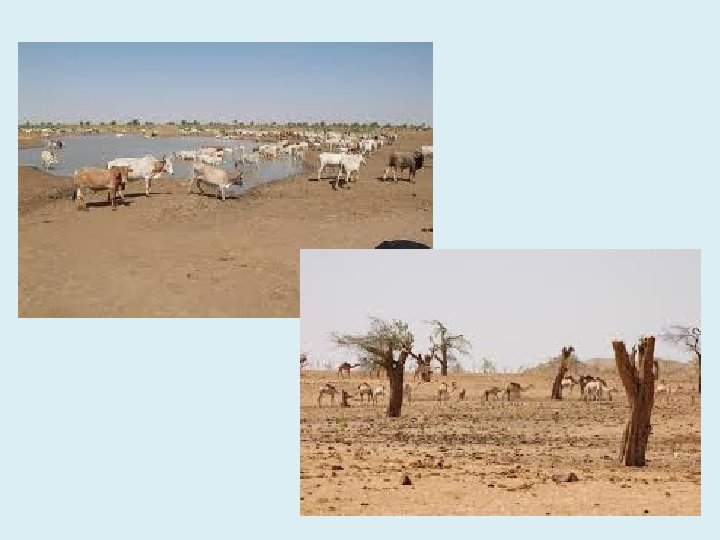 D. Land degradation • Land Degradation happens when human activity or natural processes damage the land so that it can no longer support the local ecosystem. • Desertification is the process by which land in arid or semiarid areas becomes more desert like. • Desertification has happened in the Sahel region of northern Africa. • The population in the region has grown and the land is being farmed, grazed and deforested faster than it can regenerate. • Because of overgrazing the land has few plants to hold the topsoil in place and large areas have become desert.