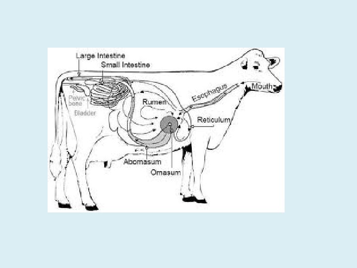 1. Ruminants • Ruminants are cud-chewing mammals that have three or four chambered stomachs (cattle, sheep and goats). • have microorganisms in their intestines to help digest plant materials that humans cannot digest. • When humans eat ruminants we are using them to convert plant material (grass stems and shrubs) into food that we can digest.