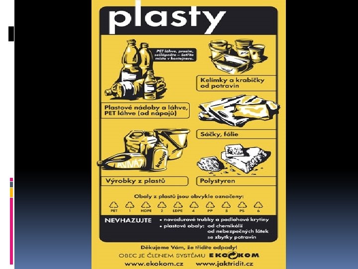 PLASTY Žlutý kontejner. Při třídění nutná mechanická minimalizace objemu (sešlápnutí, zmačkání). V některých městech a obcích se spolu s pastovým odpadem třídí i nápojové kartony. ANO Fólie, sáčky, plastové tašky, PET láhve, obaly od pracích, čisticích a kosmetických přípravků, kelímky od jogurtů, mléčných výrobků, balicí fólie od spotřebního zboží, obaly od CD disků… NE SEM NEPATŘÍ: mastné obaly se zbytky potravin nebo čistících přípravků, obaly od žíravin, barev a jiných nebezpečných látek či podlahové krytiny.