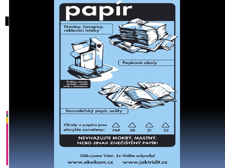 PAPÍR Modrý kontejner nebo sběrné suroviny. ANO Časopisy, noviny, sešity, krabice, papírové obaly, cokoliv z lepenky. Lze odkládat také: obálky s fóliovými okénky, papír s kancelářskými sponkami. Bublinkové obálky vhazujeme pouze bez plastového vnitřku! NE SEM NEPATŘÍ: celé svazky knih (vhazovat pouze bez vazby), uhlový, mastný nebo jakkoliv znečištěný papír a použité pleny.