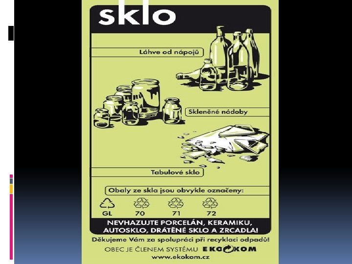 SKLO Zelený nebo bílý kontejner. Pokud jsou k dispozici oba, nutno dále třídit dle barvy. Pokud je kontejner na sklo jen jeden, pak se do něj odkládá sklo bez ohledu na barvu. ANO Zelený: barevné sklo, např. lahve od vína, alkoholických i nealkoholických nápojů, tabulové sklo z oken a ze dveří. Bílý: sklo čiré, např. sklenice od kečupů, marmelád, zavařenin… NE SEM NEPATŘÍ: keramika, porcelán, autosklo, zrcadla, drátové sklo, zlacená a pokovená skla.