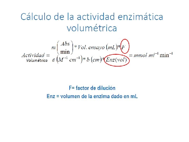 Actividad enzimática = Velocidad = Actividad enzimática: la cantidad de sustrato desaparecido o producto formado por unidad de tiempo. Por tanto sus unidades son cantidad de producto o sustrato sobre unidad de tiempo moles µmoles nmoles gramos miligramos µgramos Hora Minuto Segundo