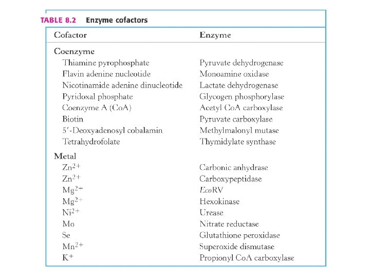 En algunas reacciones enzimáticas es necesaria la presencia de cofactores o coenzimas para llevar a cabo la catálisis. Iones metálicos como Fe 2+, Zn 2+, Mg 2+ Coenzimas Moléculas orgánicas Flavin mononucleótido o FMN Flavin adenin dinucleótido o FAD+, Nicotin amida adenin dinucleótido o NAD+ Nicotin amida adenin dinucleótido fosfato o NADP+ Grupo prostético Asociado de modo permanente a la enzima. Sitio activo de la enolasa que utiliza Mg 2+ como cofactor