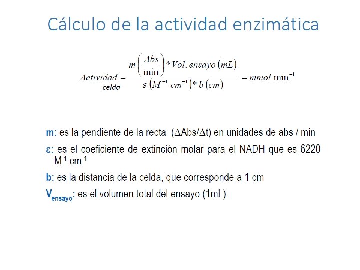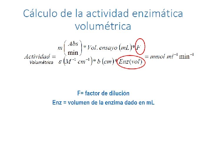 Actividad enzimática = Velocidad = Actividad enzimática: la cantidad de sustrato desaparecido o producto formado por unidad de tiempo. Por tanto sus unidades son cantidad de producto o sustrato por unidad de tiempo moles µmoles nmoles gramos miligramos µgramos Hora Minuto Segundo