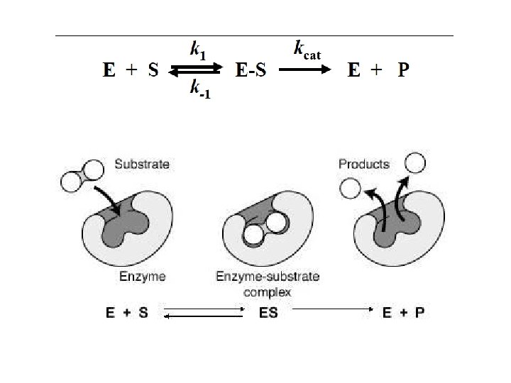 Enzimas Son catalizadores biológicos. Disminuyen la energía de activación de las reacciones que catalizan, pero NO modifican la constante de equilibrio. • Ej. Constante de equilibrio de una reacción: Keq = K 1 K-1 = 10 -3 10 -5 = 100 Reacción catalizada por una enzima acelera la reacción 10, 000 veces Keq = K 1 K-1 = 10 10 -2 = 100