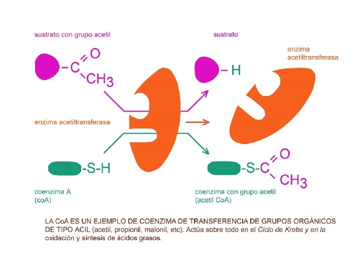 • La mayoría de los minerales actúan como cofactores inorgánicos en reacciones enzimáticas. • Las coenzimas transportan grupos químicos de una enzima a otra. Algunos de estos compuestos, como la riboflavina, la tiamina y el ácido fólico son vitaminas. Los grupos químicos intercambiados incluyen el ion hidruro (H-) transportado por NAD o NADP+, el grupo fosfato transportado por el ATP, el grupo acetilo transportado por la coenzima A, los grupos formil, metenil o metil transportados por el ácido fólico y el grupo metil transportado por la S-Adenosil metionina.