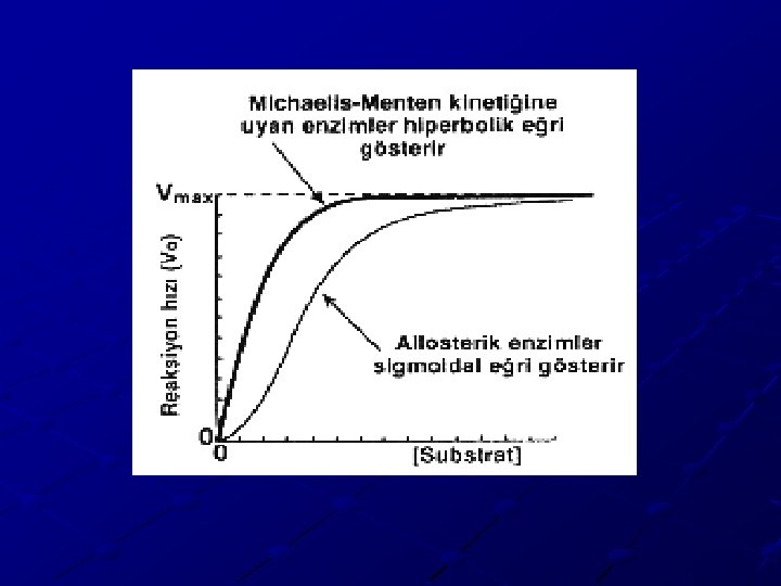 Reaksiyon hızını etkileyen faktörler: Substrat konsantrasyonu: Bir reaksiyonun hızı (v): Birim zamanda ürüne çevrilen substrat molekülü sayısıdır ve genellikle dakikada oluşan mol ürün olarak ifade edilir ( mol/dak). Enzim katalizli bir reaksiyonun hızı substrat konsantrasonu artışı ile maksimum hıza (Vmax) ulaşana kadar artar. Enzimlerin çoğu Michealis-Menten kinetiği gösterir. Reaksiyon hızının (Vo) substrat konsantrasyonuna S karşı grafiğe çizilince hiperbolik bir şekil elde edilir (myoglobinin oksijen disosiasyon eğrisi benzeri). Fakat allosterik enzimler sigmoidal eğri gösterir (hemoglobin oksijen disosiasyon eğrisi benzeri).