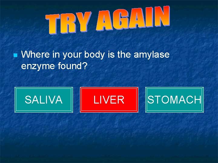 QUIZ - QUESTION 1 n Where in your body is the amylase enzyme found? SALIVA LIVER STOMACH