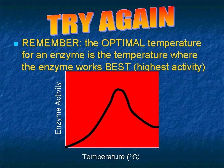 QUIZ - QUESTION 5 REMEMBER: the OPTIMAL temperature for an enzyme is the temperature where the enzyme works BEST (highest activity) Enzyme Activity n Temperature ( C)